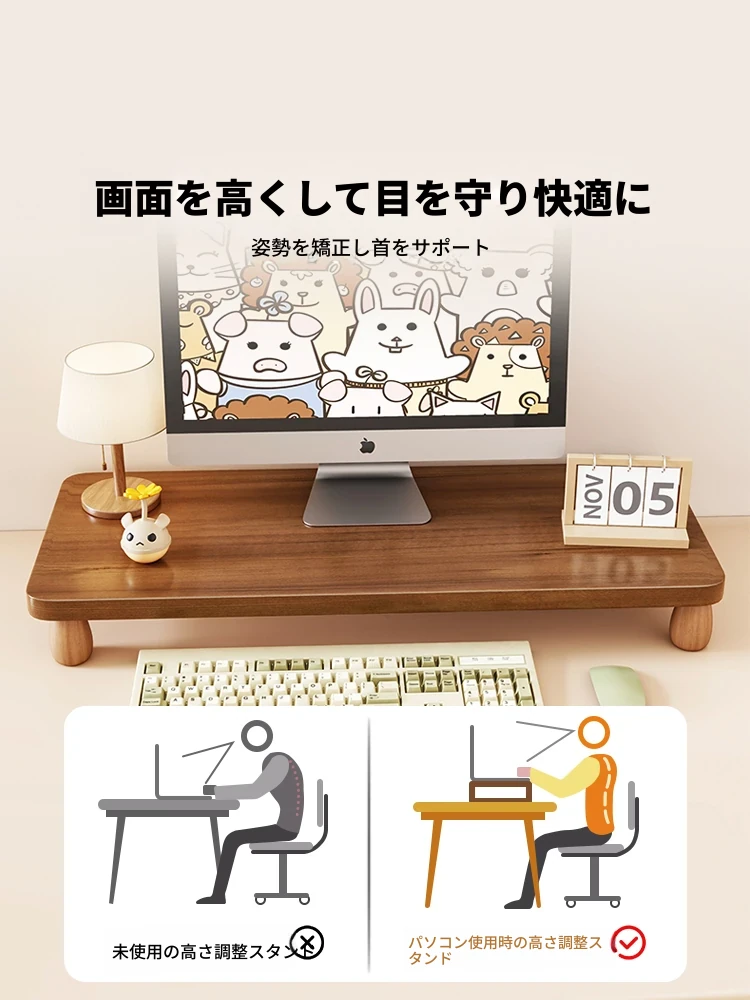 天然木材使用のデスクトップモニター昇降スタンド - スタイリッシュな収納スペースでオフィスをスッキリ整理!快適な作業環境を実現する、耐久性抜群のディスプレイサポート。